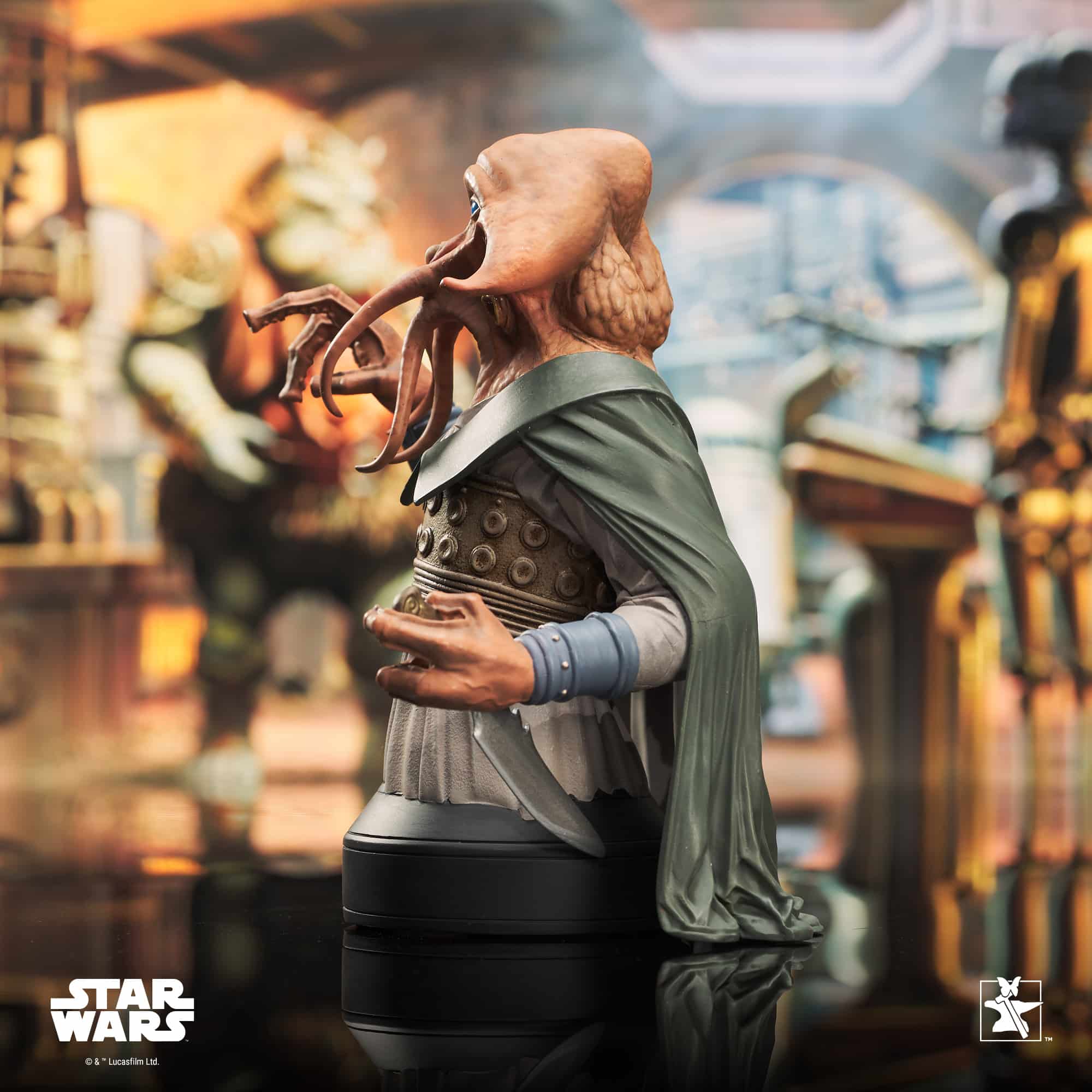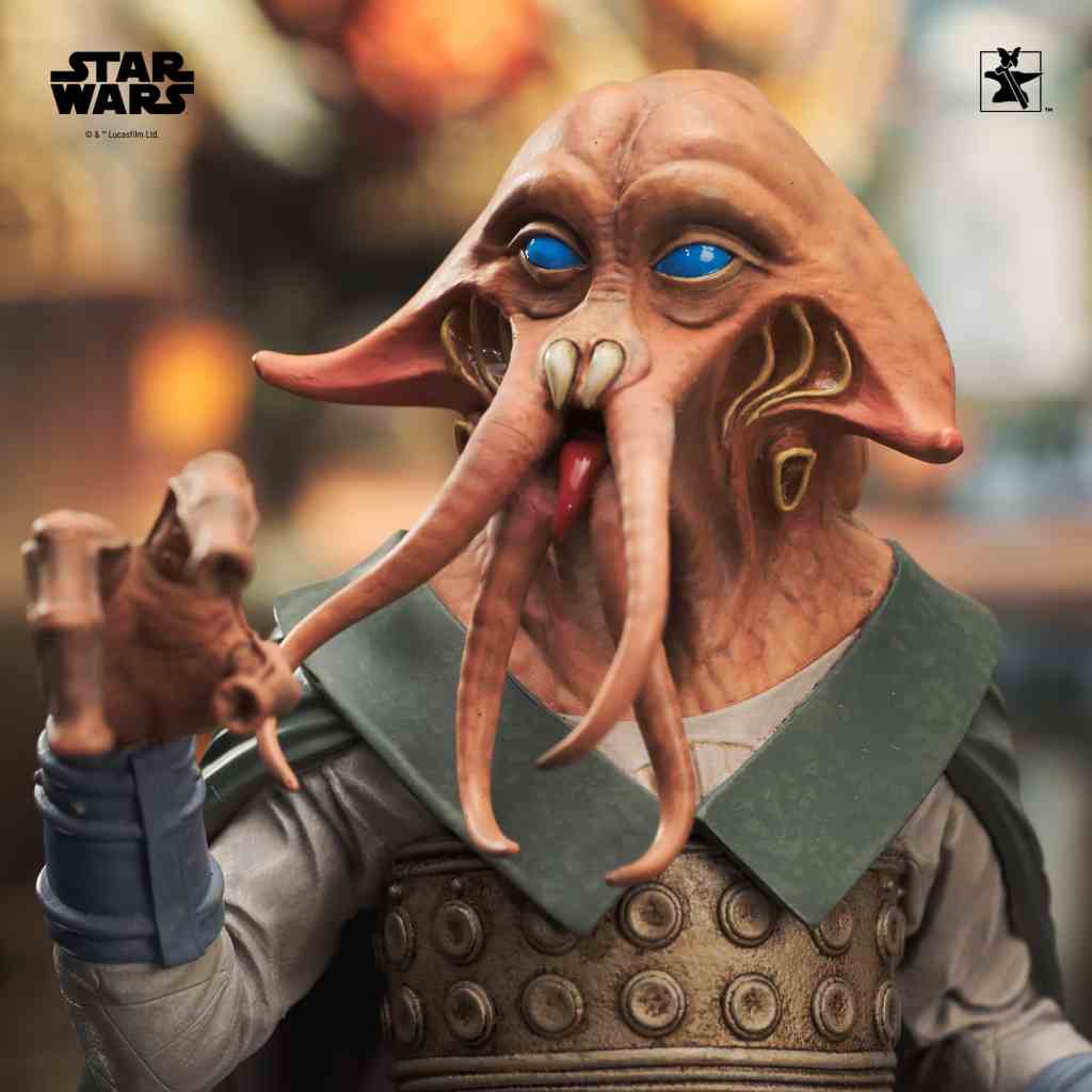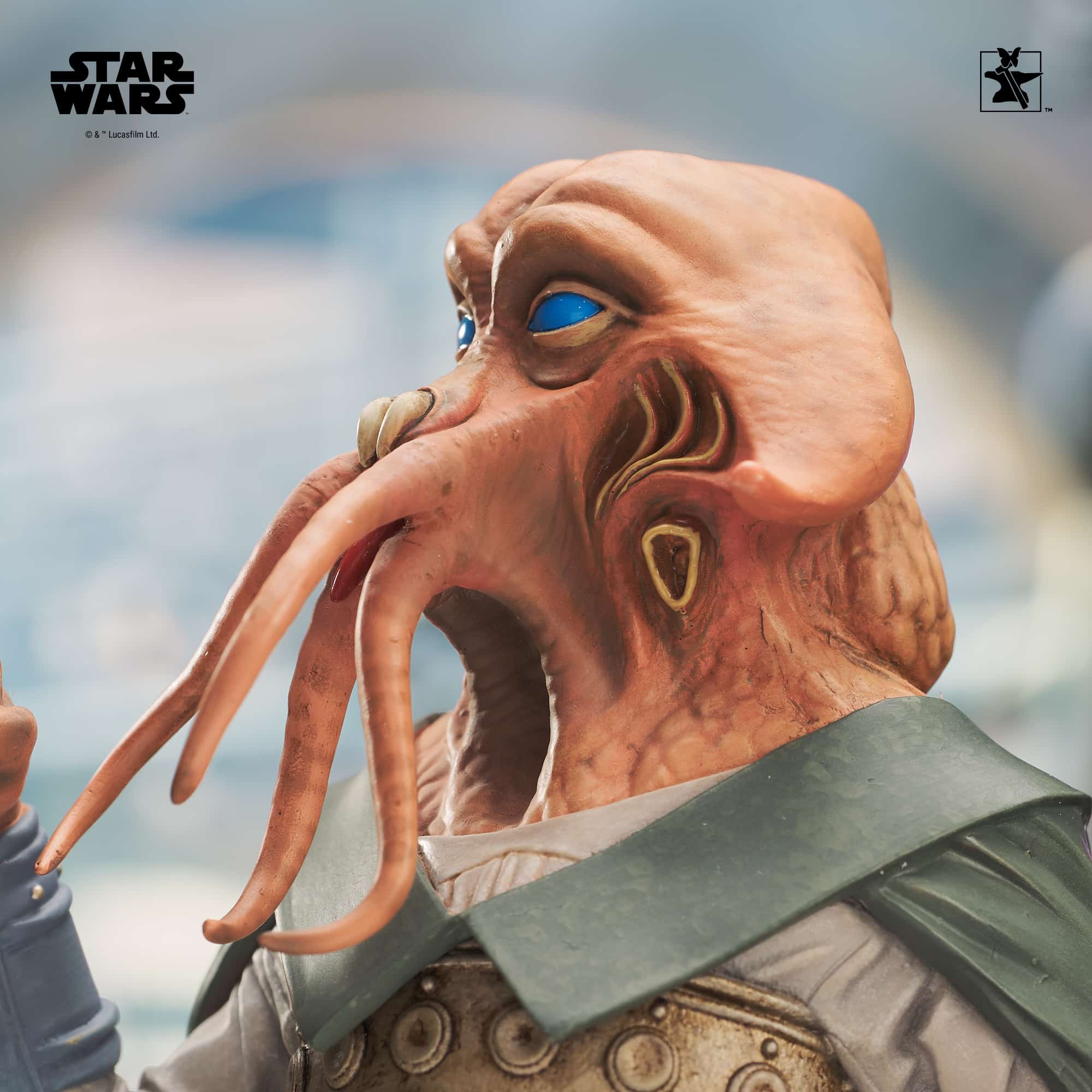 Quarren™, or “Squid Heads” as they are sometimes rudely called, are an alien species characterized by the four tentacles that protrude from their jaws. They have deep turquoise eyes, and each hand is capped with finned or suction-cup tipped fingers. They are capable swimmers, and like the squids they resemble, they are able to spit out clouds of ink as a defensive measure. Quarren hail from the planet Mon Cala™, the world they share with the Mon Calamari™. During the Clone Wars™, the Separatists backed a Quarren insurrection that plunged the planet into civil war. Designed, modeled and prototyped using top-of-the-line 3D technology, this 1:6 scale mini-bust of Tessek represents the next of our new collection from the ongoing Star Wars saga. Each mini-bust is hand-cast, hand-painted and hand-numbered with a limited-edition certificate of authenticity. May the Force be with you! Limited to 500 pieces.