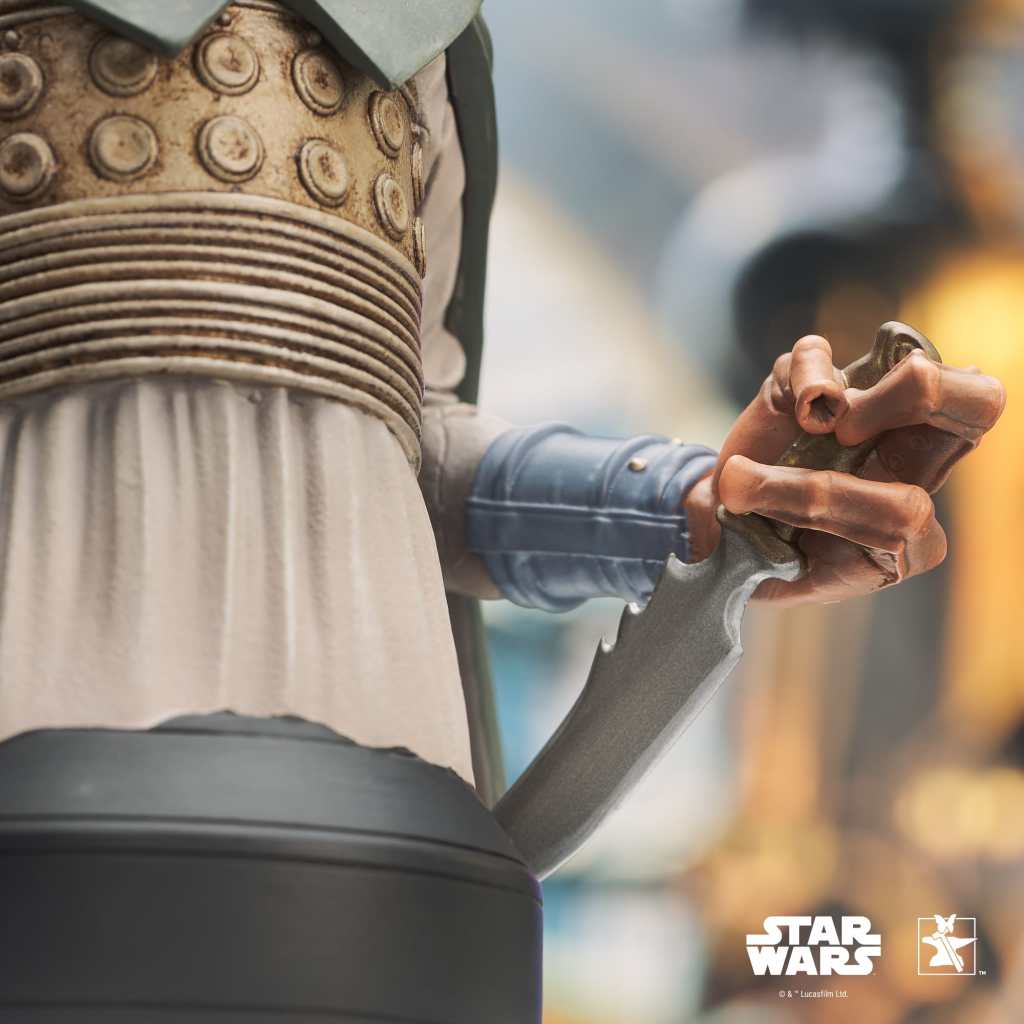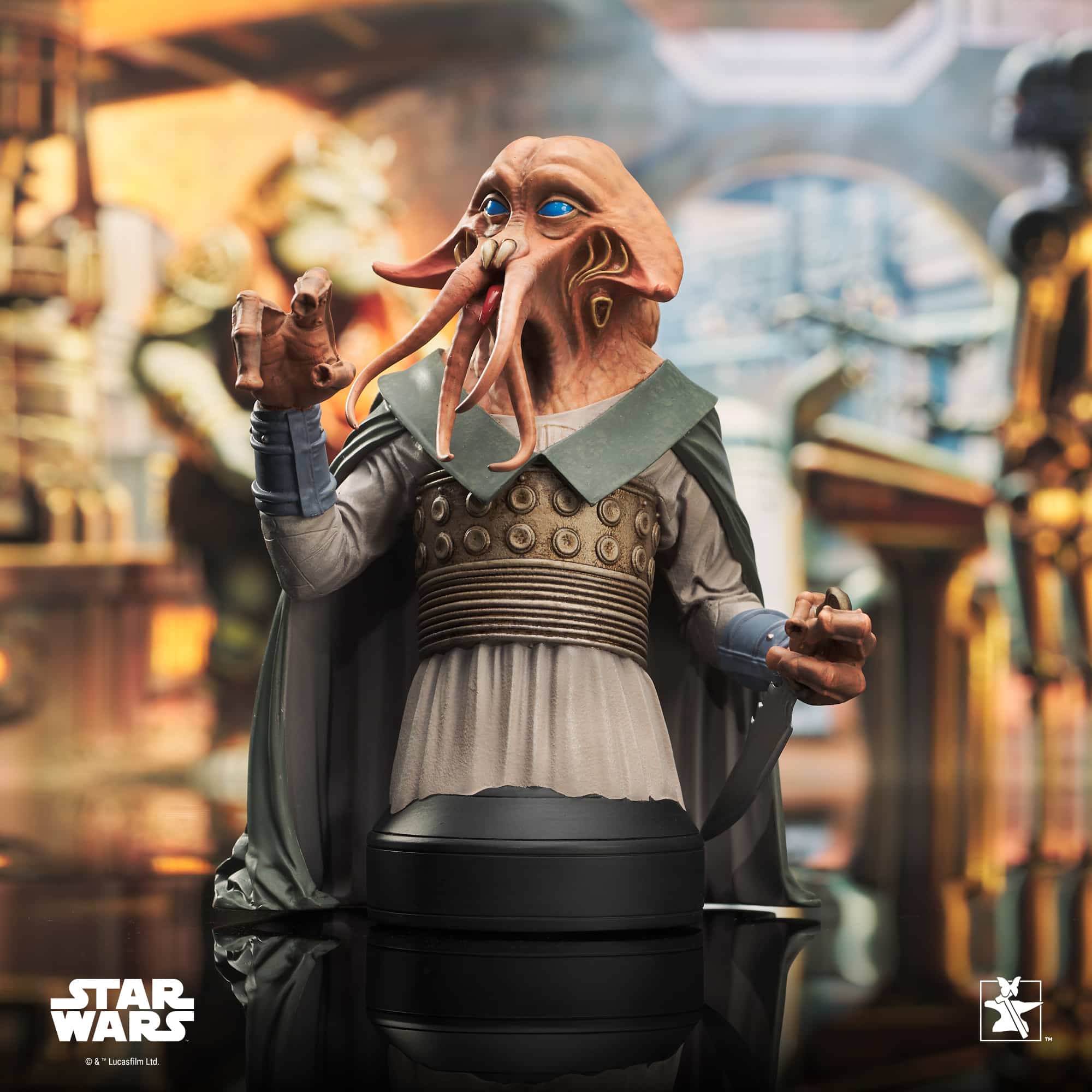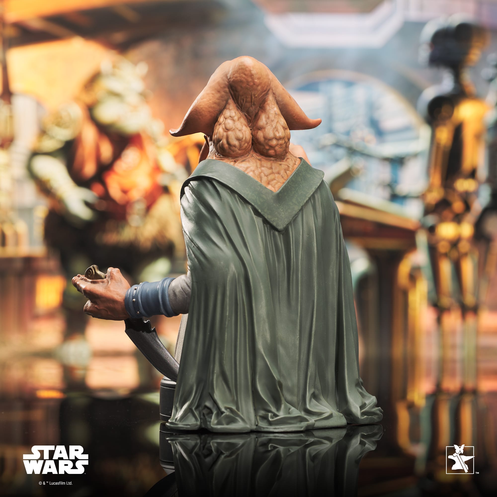 Quarren™, or “Squid Heads” as they are sometimes rudely called, are an alien species characterized by the four tentacles that protrude from their jaws. They have deep turquoise eyes, and each hand is capped with finned or suction-cup tipped fingers. They are capable swimmers, and like the squids they resemble, they are able to spit out clouds of ink as a defensive measure. Quarren hail from the planet Mon Cala™, the world they share with the Mon Calamari™. During the Clone Wars™, the Separatists backed a Quarren insurrection that plunged the planet into civil war. Designed, modeled and prototyped using top-of-the-line 3D technology, this 1:6 scale mini-bust of Tessek represents the next of our new collection from the ongoing Star Wars saga. Each mini-bust is hand-cast, hand-painted and hand-numbered with a limited-edition certificate of authenticity. May the Force be with you! Limited to 500 pieces.
