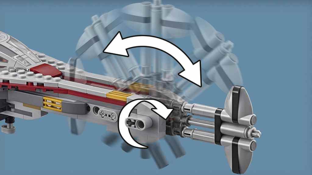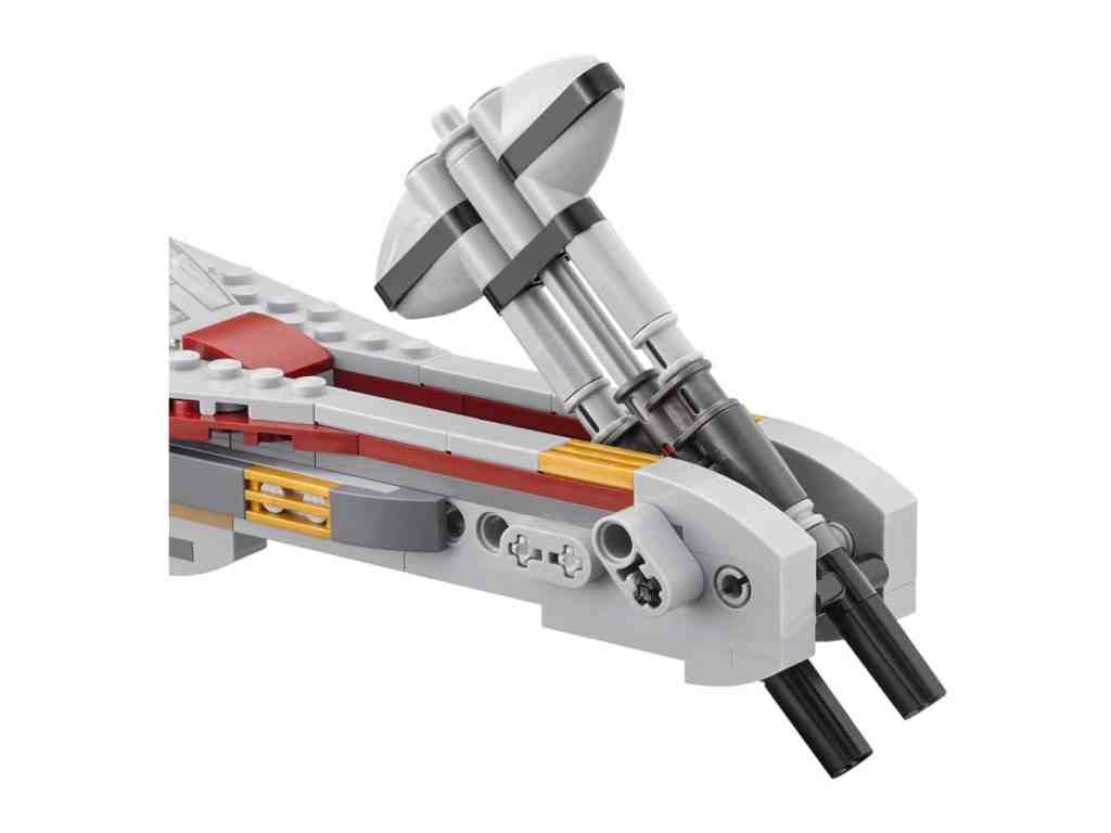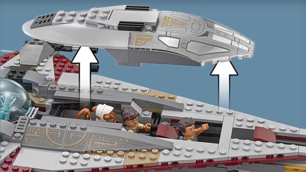 - Verfügt über ein abnehmbares Cockpitdach, unter dem drei Minifiguren und R0-GR Platz haben, eine aufklappbare durchsichtige Kuppel mit herausnehmbarem Antriebskristall, zwei federunterstützte Shooter und einen ausklappbaren Rammbock.