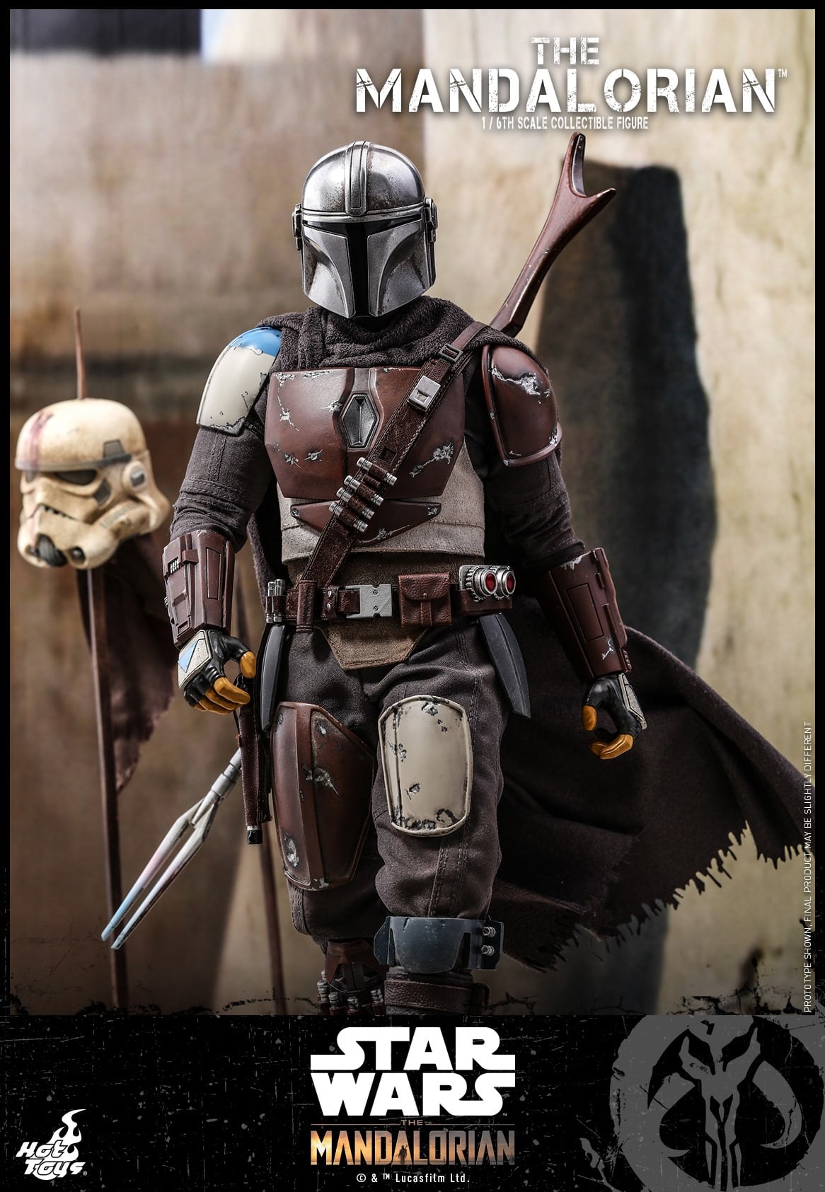 The highly-accurate collectible figure features meticulously crafted helmet and armor pieces, finely tailored outfit, beautifully applied weathering effects, a blaster rifle, a blaster pistol, accessories to set up a diorama base including a battle damaged Stormtrooper helmet, a flag, spears and desert-themed figure base.