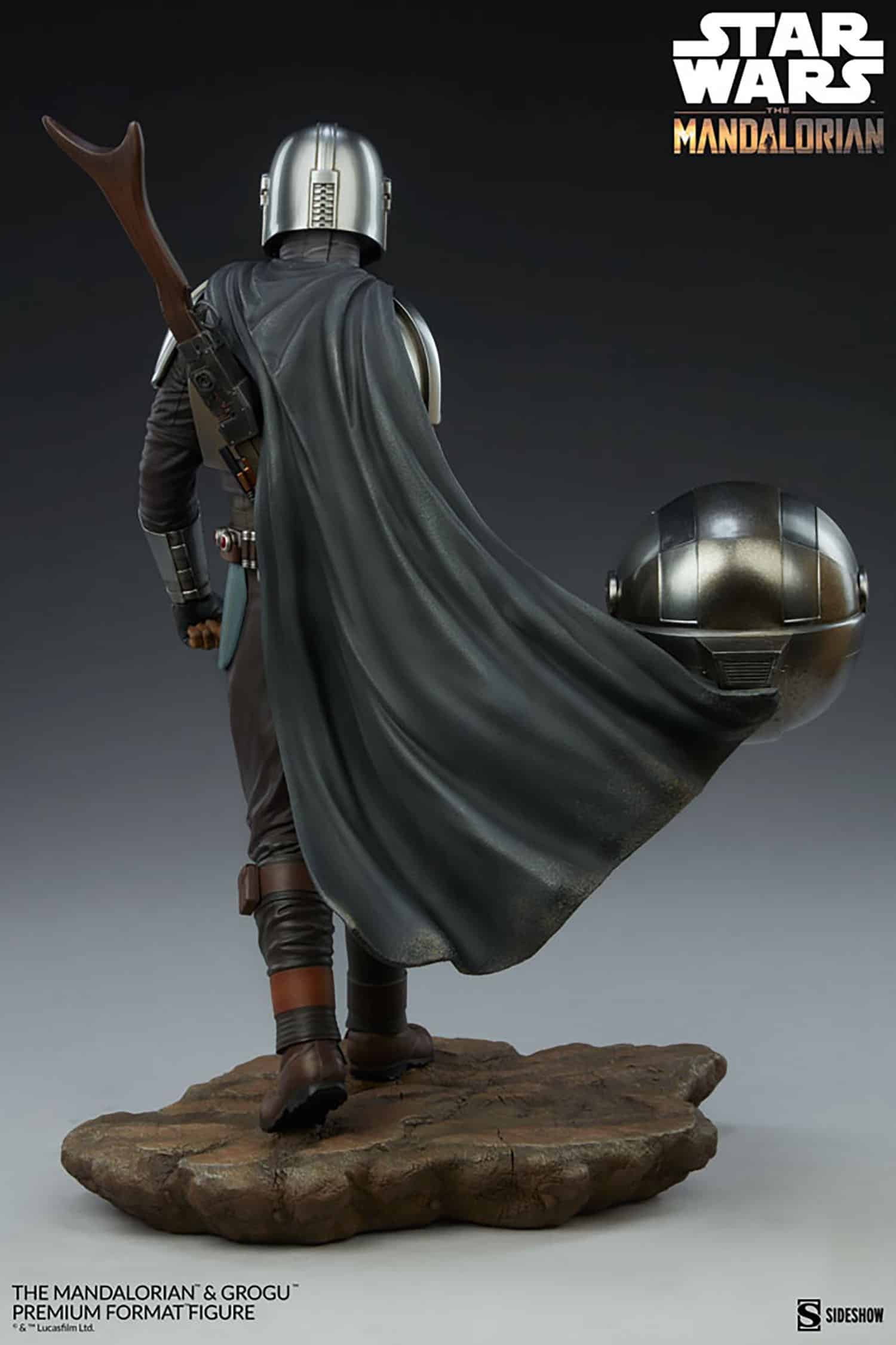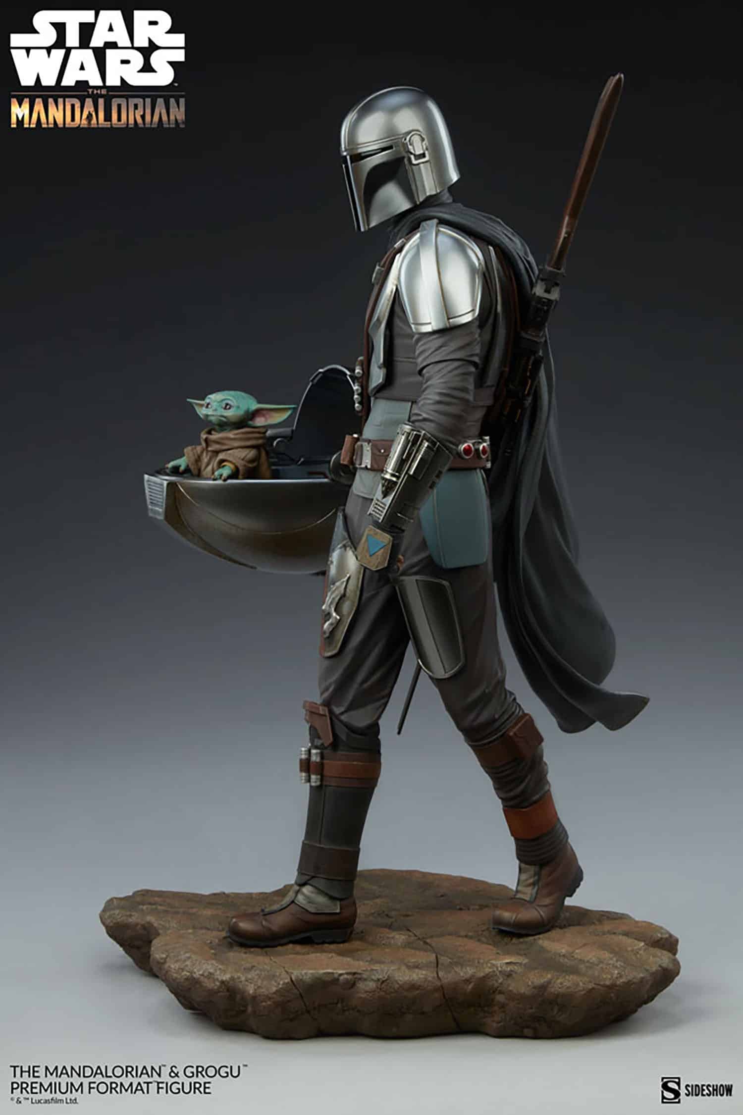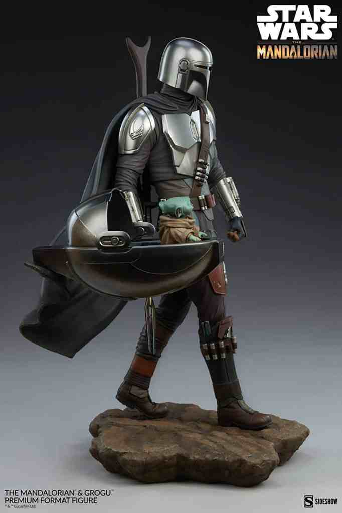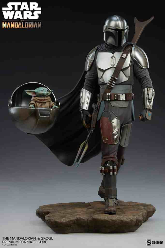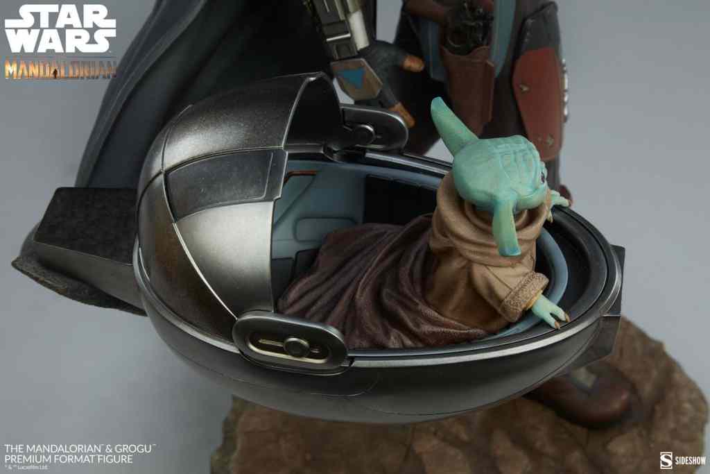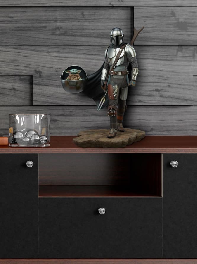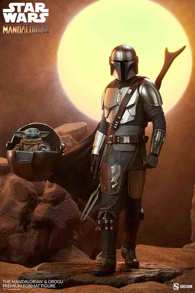 The polystone Mandalorian and Grogu Premium Format Figure measures 20″ tall and is a detailed, dynamic, fully sculpted depiction of this renowned bounty hunter inspired by an iconic shot from the first season of the streaming series. Standing alongside the Child’s signature hovering pram, the Mandalorian braves the dangerous galaxy to protect what was once his prey. His silver armor reflects the hard work and weathering it took to acquire enough beskar to create each piece, complete with his mudhorn signet, the symbol given to him by the Armorer in accordance with Mandalore tradition. Equipped with his bounty hunting tools of the trade, The Mandalorian proves himself to be one of the galaxy’s most skilled and fearsome warriors.