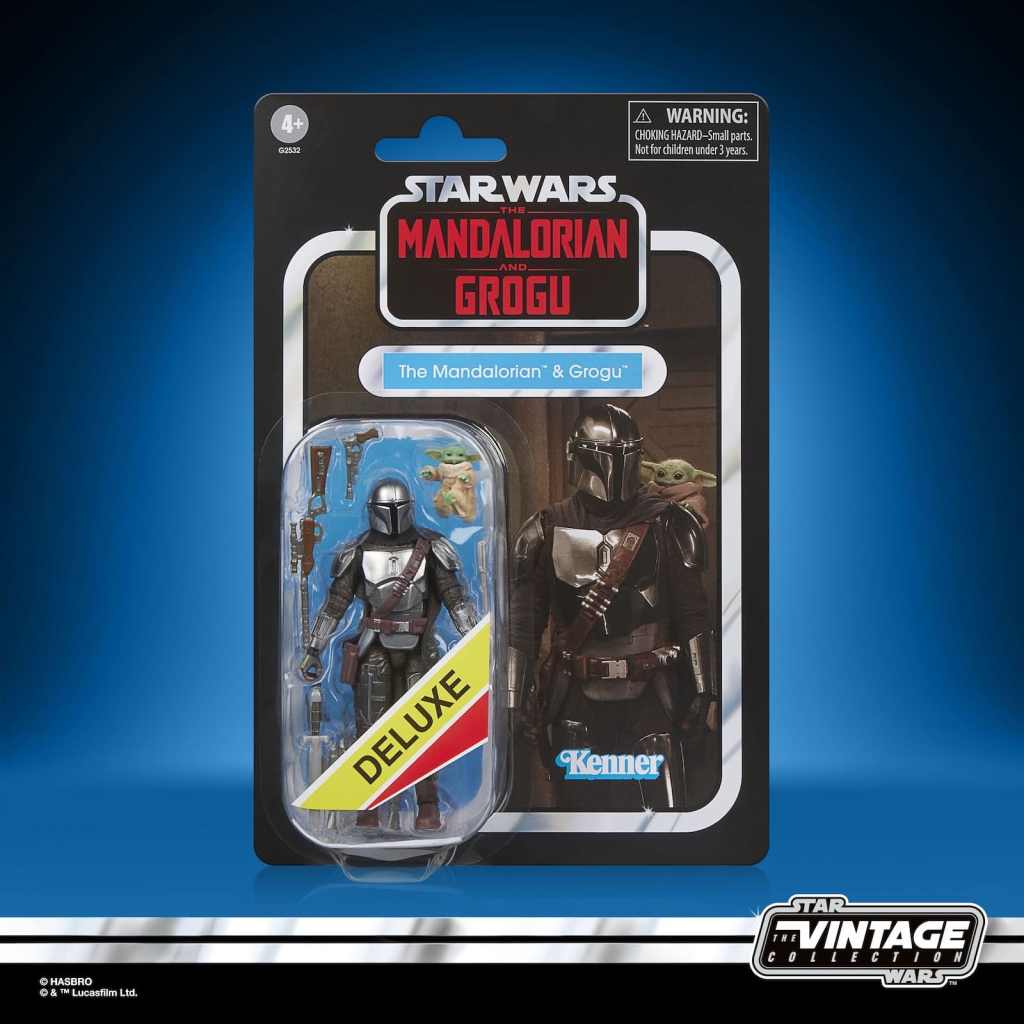 - Din Djarin kommt mit einer austauschbaren rechten Hand für einen weiteren Waffengriff, einem Jetpack, einem Blastergewehr, einer Blasterpistole, einem Vibromesser und einem Schwert