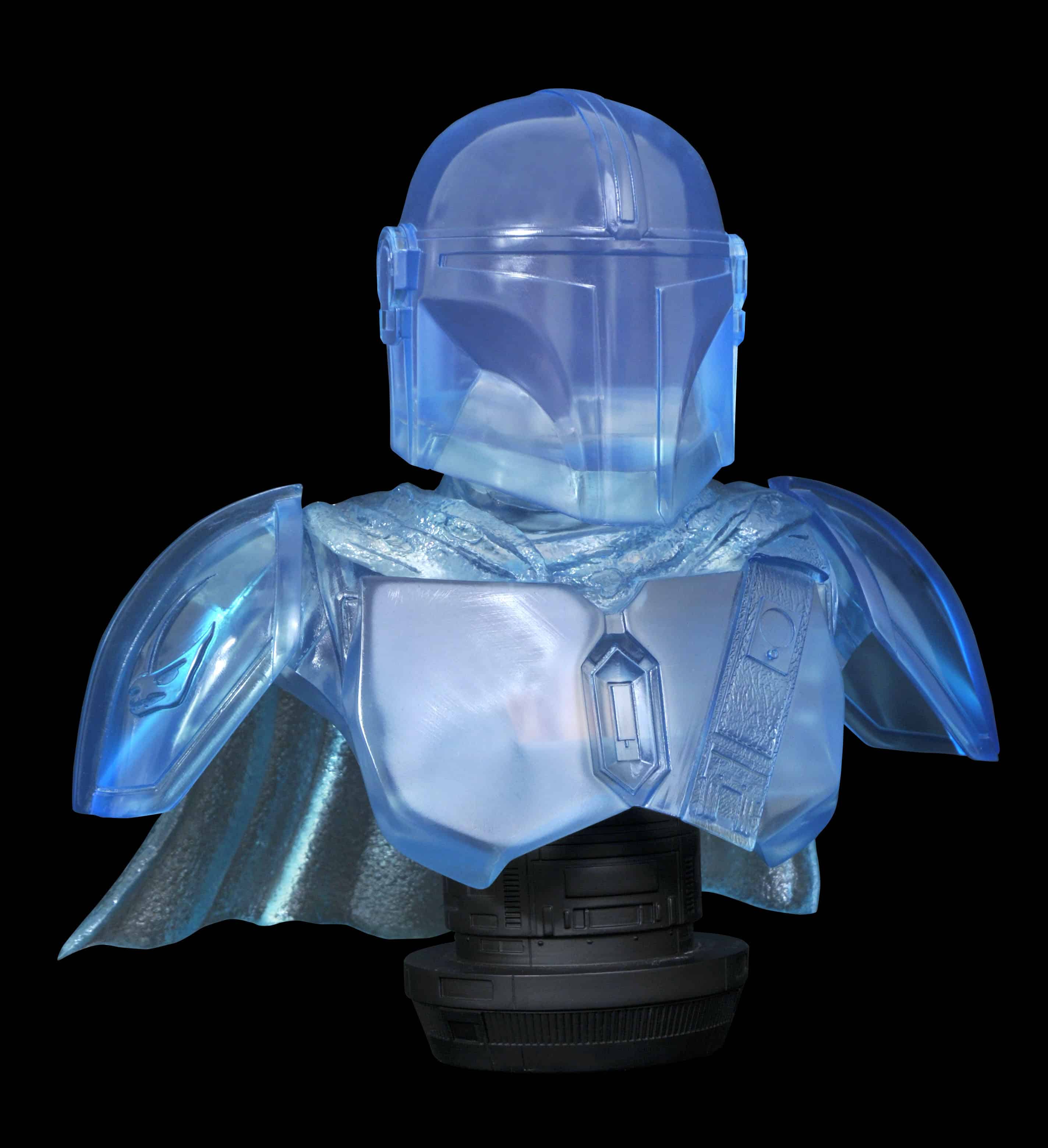 Nach Boba Fett kommt nun also der Mandalorianer als Hologram-Version. Die Neuankündigung basiert auf dem Sculpt der Mandalorian Beskar-Büste, die sich derzeit im Versand an alle Vorbesteller befindet und wird als Hologram natürlich vollständig aus transparent-blauem Resin produziert. Sie wird im Maßstab 1:2 produziert und ist gut 25 cm groß.
