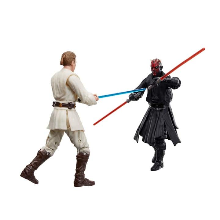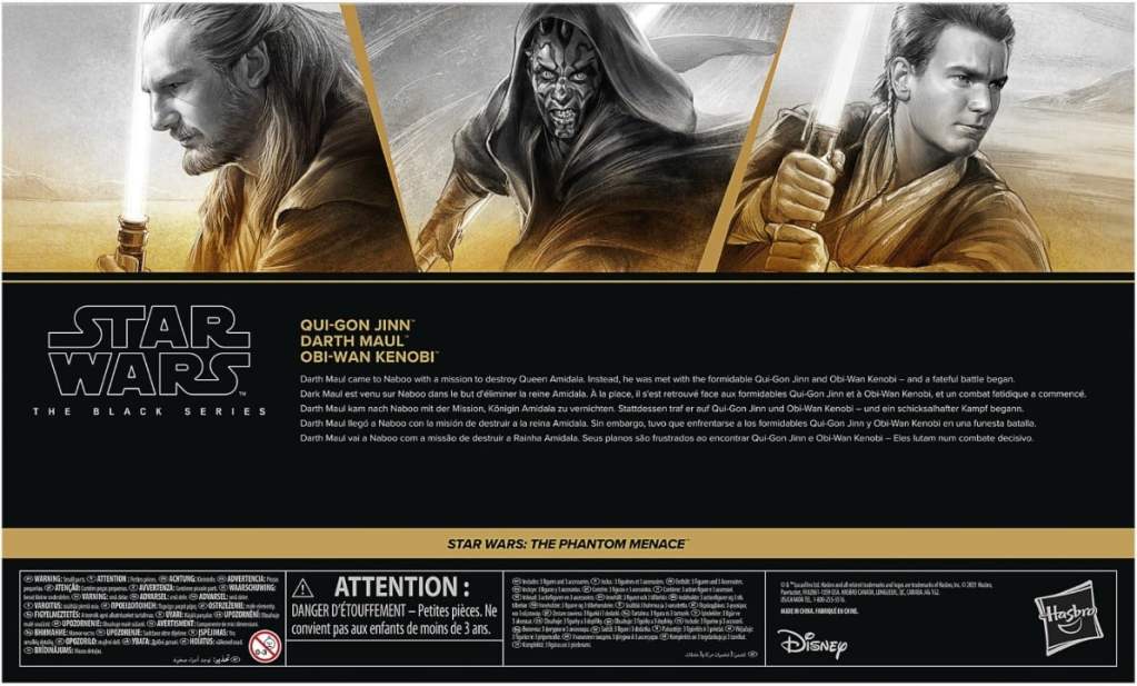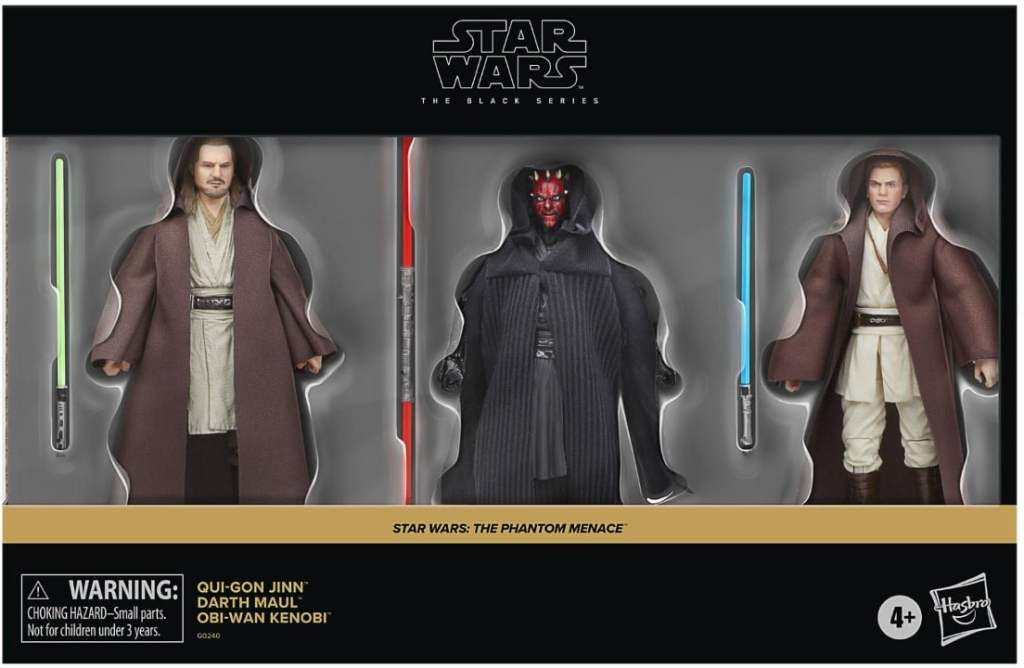 STAR WARS  fans and collectors can imagine scenes from the  STAR WARS galaxy with this premium 6-inch STAR WARS: THE BLACK SERIES STAR WARS: THE PHANTOM MENACE 3-pack, featuring Qui-Gon Jinn, Darth Maul and Obi-Wan Kenobi, inspired by the characters’ appearances during the “Duel of Fates” scene in STAR WARS: THE PHANTOM MENACE. Darth Maul came to Naboo with a mission to destroy Queen Amidala. Instead, he was met with the formidable Qui-Gon Jinn and his apprentice, Obi-Wan Kenobi – and a fateful battle began. Fans and collectors can display these fully articulated figures featuring premium detail and multiple points of articulation in their collection. Includes 3 figures and 3 entertainment-inspired accessories including each character’s signature Lightsabers.