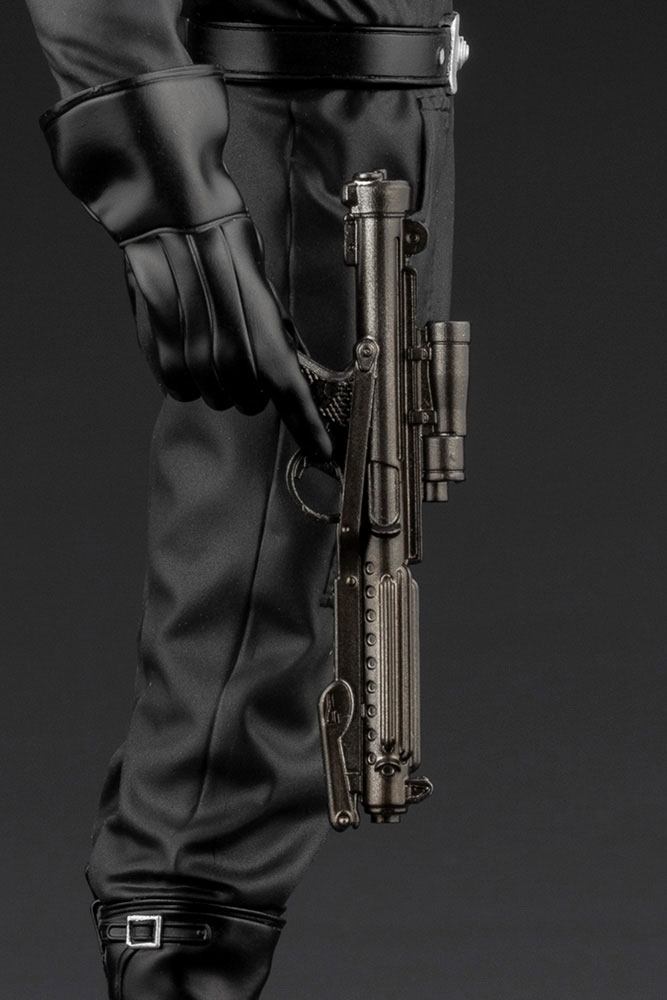 The ArtFX+ TIE Fighter Pilot features the pilot who can be posed at full attention or can be displayed with an E-11 blaster rifle or blaster pistol for optimal display options.