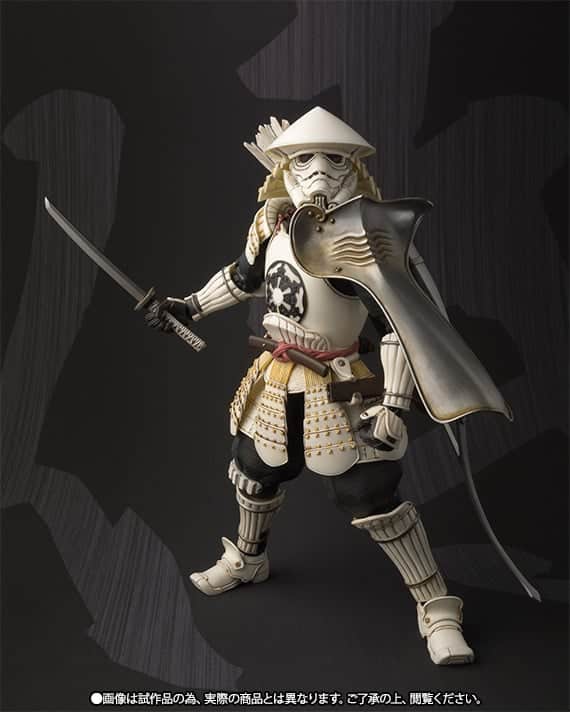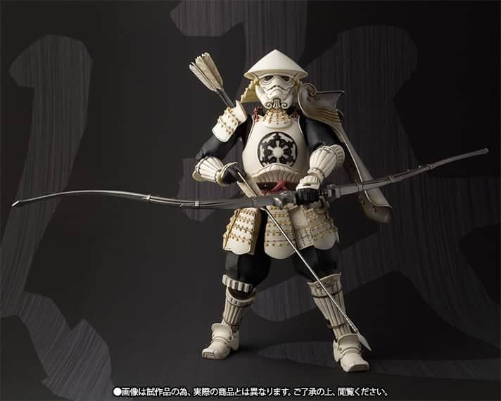Make room on your shelve because the next member of the Meisho Movie Realization Star Wars line is here. In this case, yumi means „archer“ and this Stormtrooper lives up to his name with an impressive Japanese-style bow just as long as he is tall! The helmet design has also been revised to mimic the traditional feudal archer headwear. Set includes interchangeable hands (x6), bow and arrow set, katana set, and quiver.