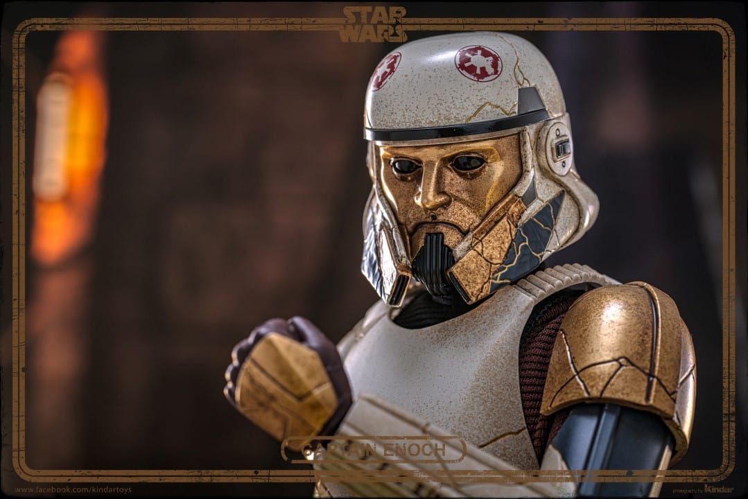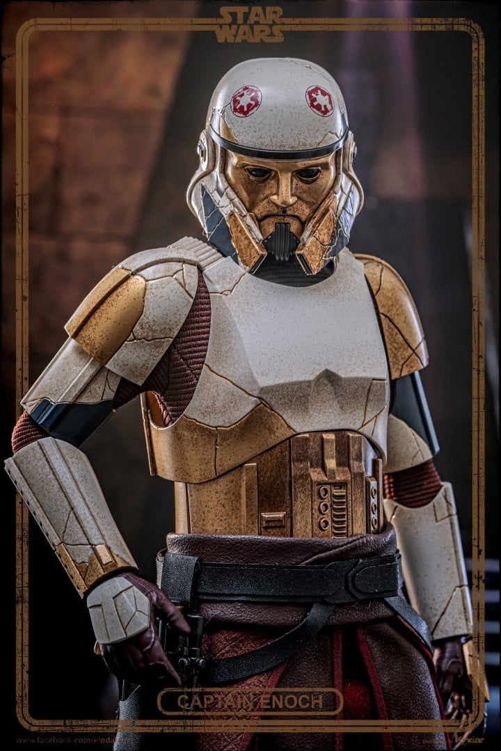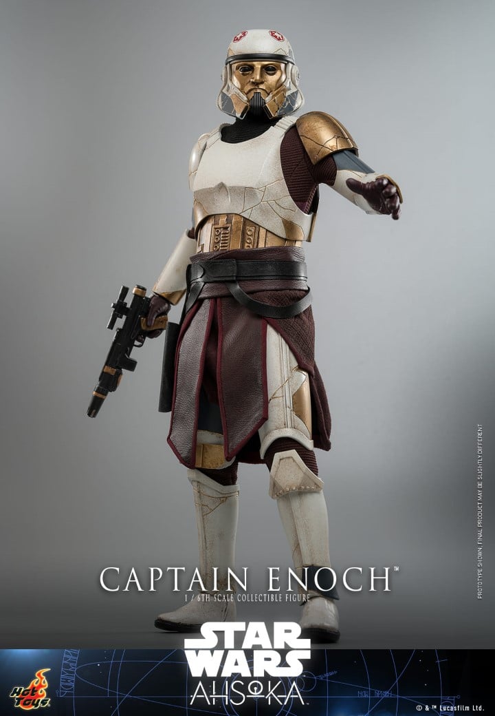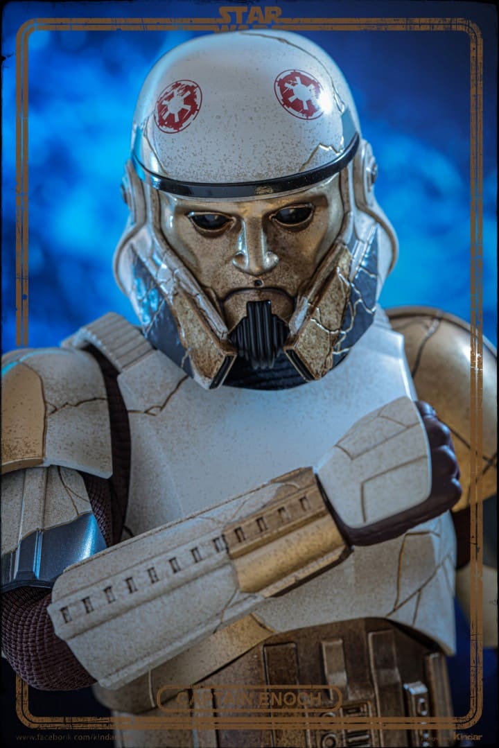 Character Info „Captain Enoch ist der Captain der Garde von Großadmiral Thrawn und führt die sogenannten Nachttruppler an. Seine auffällige Rüstung zeichnet sich durch ein goldenes Helmvisier aus, das einem menschlichen Gesicht nachempfunden ist. Enoch und seine Truppen wurden während der Befreiung von Lothal auf dem Sternenzerstörer Chimaera von Purrgil in die ferne Galaxis nach Peridea entführt. Dort dienten sie Thrawn weiterhin treu und arbeiteten mit den Dathomiri-Großmüttern zusammen, um ihre Rückkehr in die bekannte Galaxis zu planen.“