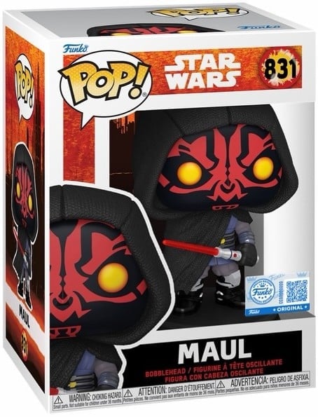 Angeführt wird die Reihe natürlich vom namensgebenden Protagonisten selbst. Wir erhalten zwei Varianten des ehemaligen Sith-Lords, die ihn in seiner Ära als Anführer des Schatten-Kollektivs zeigen. Während die Nummer 828 Maul in klassischer Kampfpose mit seinem ikonischen Doppellichtschwert darstellt, wirkt die Nummer 831 deutlich düsterer. Diese Version zeigt ihn mit Kapuze und einem eher abwartenden, bedrohlichen Auftreten und erscheint als Funko Exclusive.