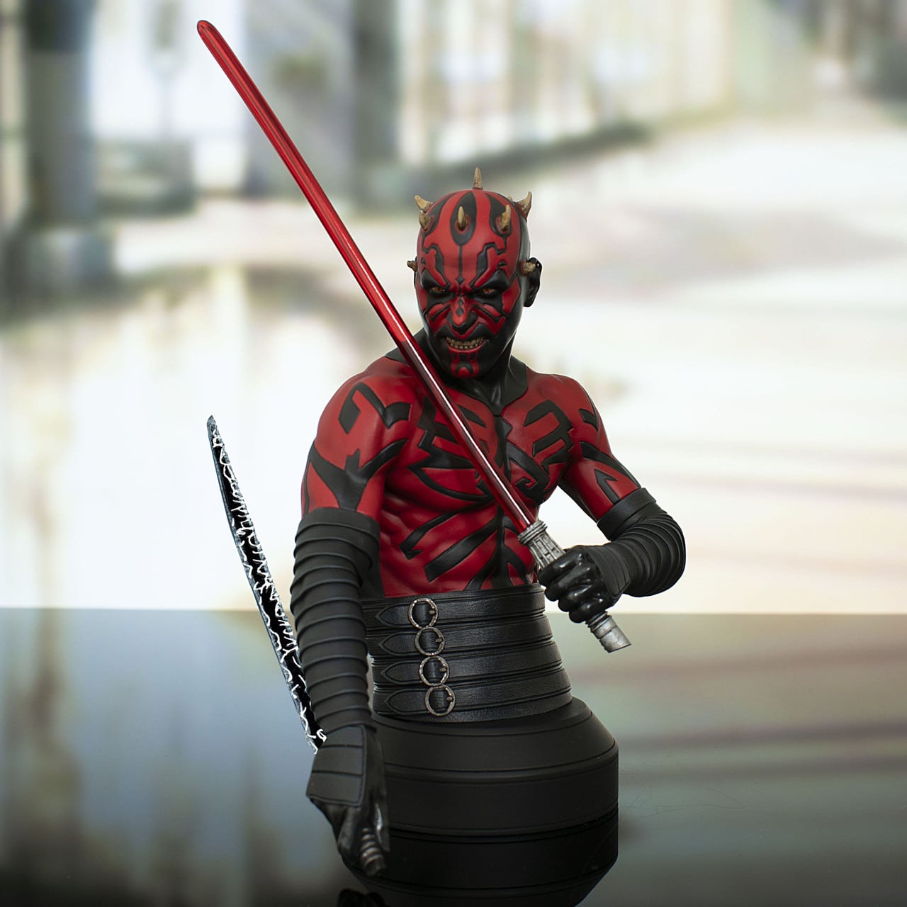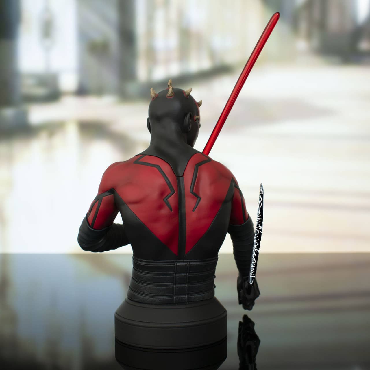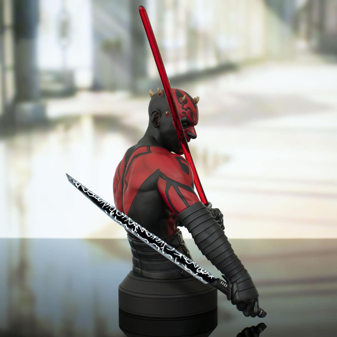 Die detailreiche Mini-Büste ist etwa 6 Zoll (ca. 15 cm) groß und besteht aus hochwertigem Resin. Sie fängt die bedrohliche Präsenz von Darth Maul perfekt ein, inklusive Lichtschwert und Dunkelschwert in Angriffsposition und seinem charakteristischen düsteren Ausdruck.