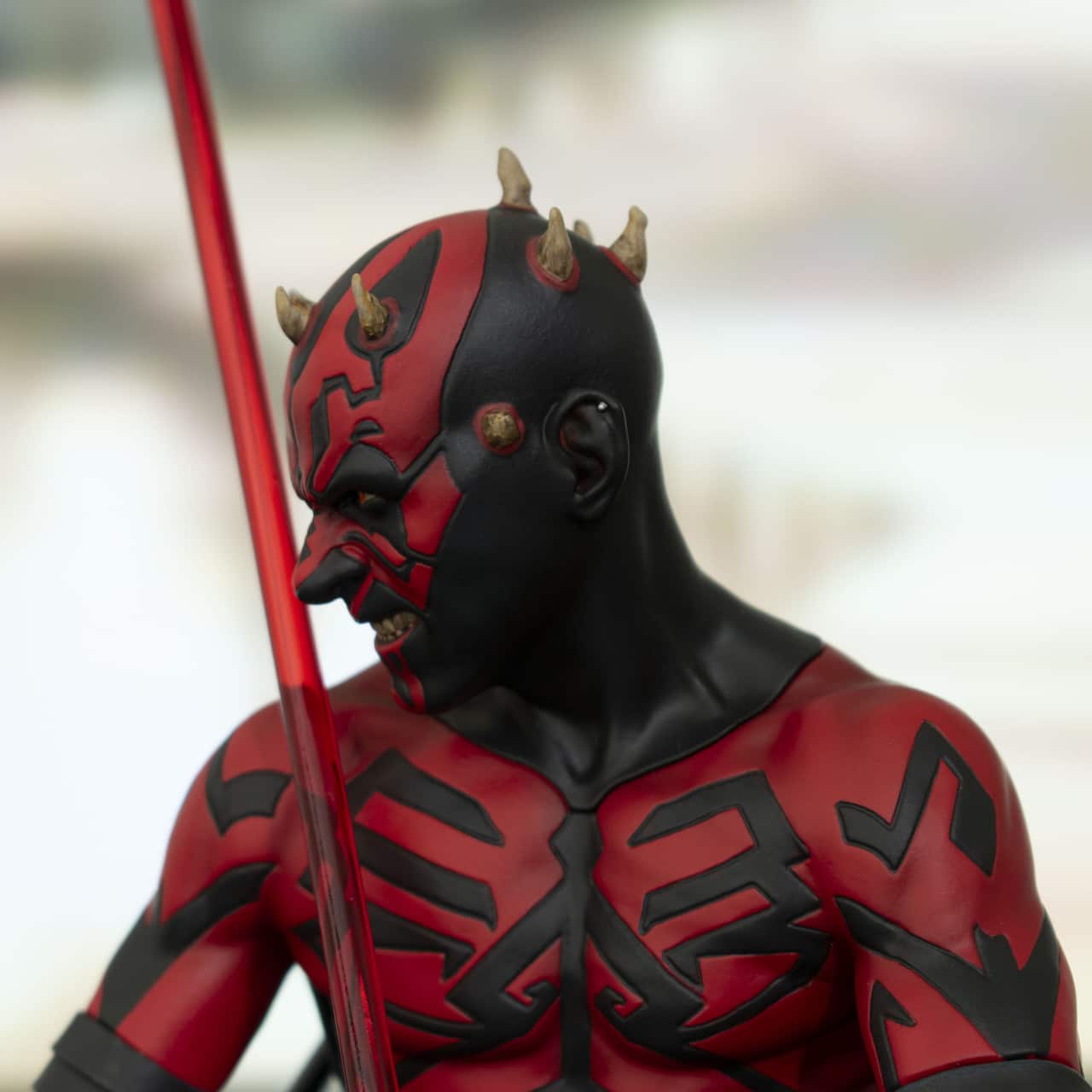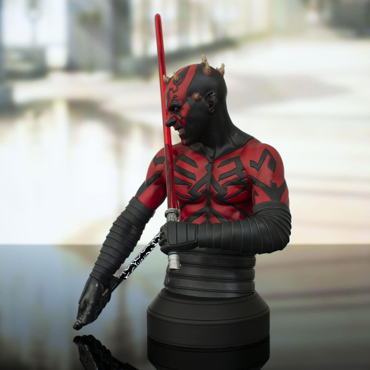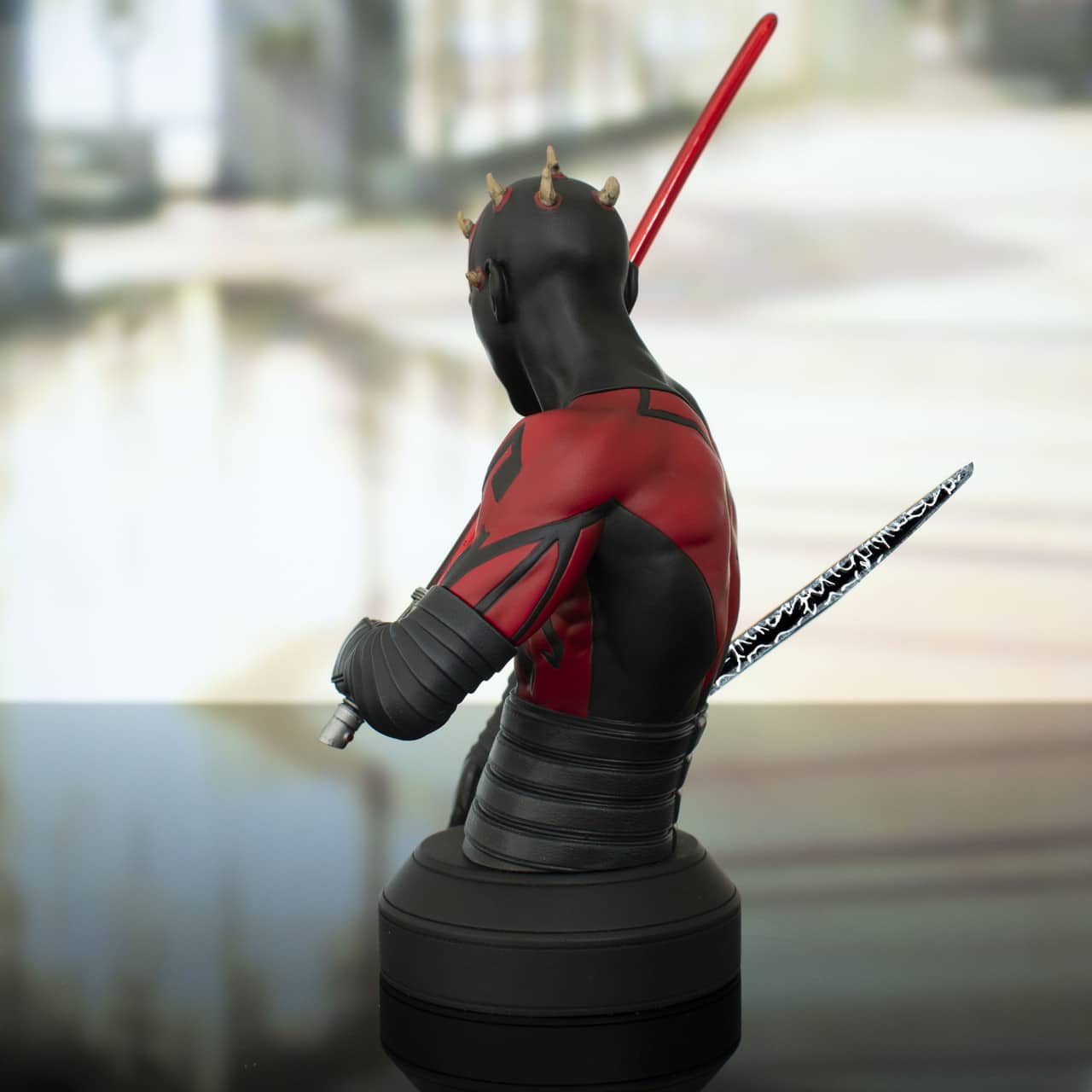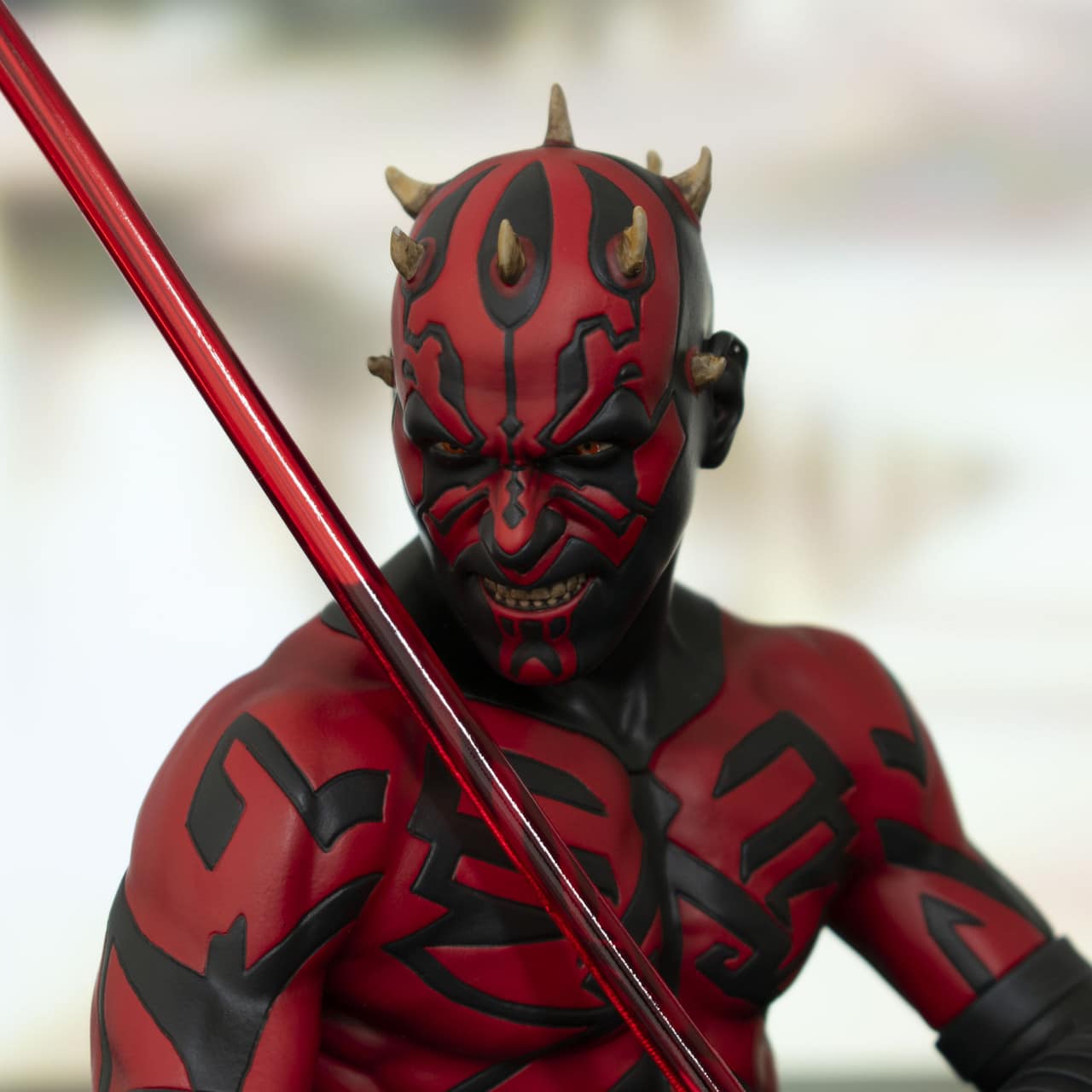 Die detailreiche Mini-Büste ist etwa 6 Zoll (ca. 15 cm) groß und besteht aus hochwertigem Resin. Sie fängt die bedrohliche Präsenz von Darth Maul perfekt ein, inklusive Lichtschwert und Dunkelschwert in Angriffsposition und seinem charakteristischen düsteren Ausdruck.