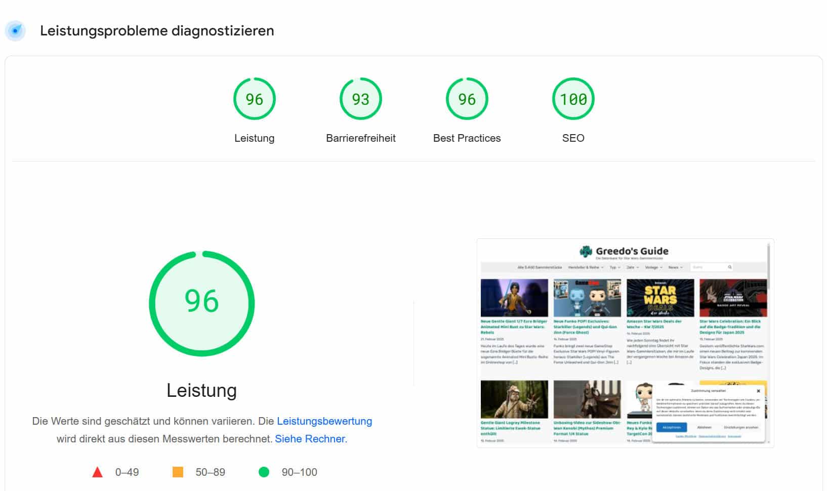 Ein zentrales Ziel war es, die Ladezeiten der Website weiter zu reduzieren. Die Verbesserungen im Vergleich zu Starwarscollector.de waren zwar bereits deutlich spürbar, mir aber noch nicht genug. Mithilfe diverser Möglichkeiten im Bereich Caching, CSS und JavaScript konnten Ladezeiten nochmals reduziert und somit die Nutzererfahrung weiter verbessert werden. Hier ein Screenshot der Websitediagnose von Google’s PageSpeed Insights: