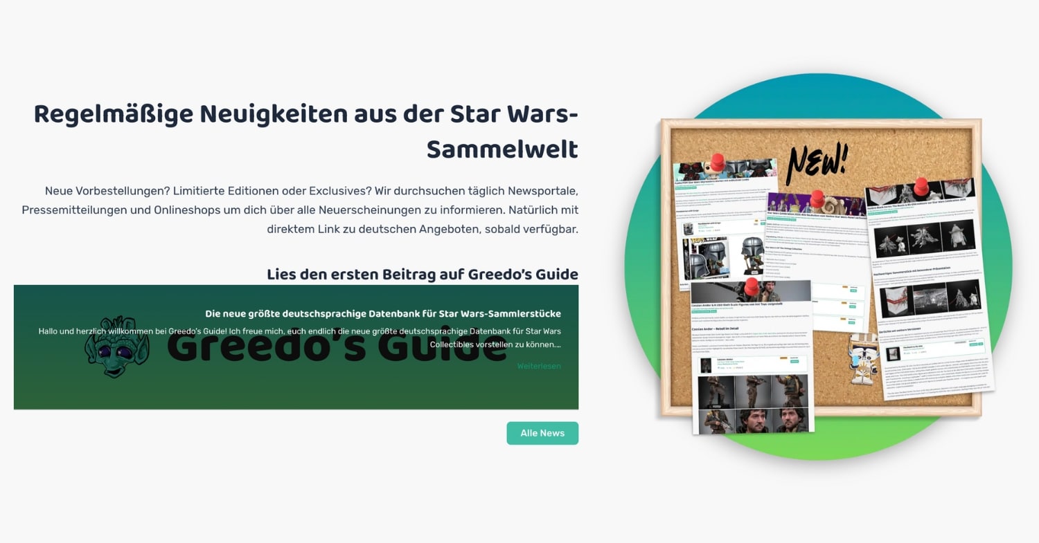 Die auffälligste Änderung: die neue Startseite . Ich wollte einen Ort schaffen, der euch auf den ersten Blick zeigt, was Greedo’s Guide ausmacht, nämlich ein stetig wachsendes Archiv für Star Wars Collectibles mit mittlerweile über 5.650 Einträgen. Statt einer simplen Übersicht der letzten News gibt es jetzt endlich auch sichtbare Counter, die euch zeigen, wie viele Sammlerstücke, Bilder und News-Beiträge aktuell im System vorhanden sind – und diese Zahlen steigen fast täglich. Außerdem ist der Einstieg in den Guide, zu den neuesten News und zu den besten Deals nun deutlich intuitiver gestaltet. Alles, was ihr braucht, findet ihr mit wenigen Klicks – und das aufgeräumter und durchgestylter als je zuvor.