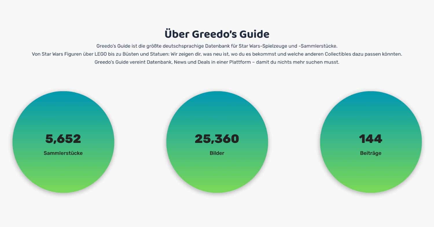 Zum Start der Seite waren erst 267 Sammlerstücke in Greedo’s Guide enthalten, die über eine Bildergalerie und eine vollständige Produktbeschreibung verfügten. Das entsprach gerade einmal 4,97 Prozent. Heute sind es 2.822 Sammlerstücke, was unter Beachtung der erhöhten Gesamtanzahl von 5.652 Collectibles einer Vervollständigung von 49,93 Prozent entspricht.