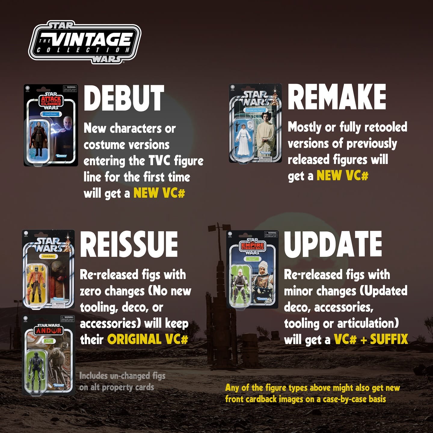 Hasbro reagiert mit diesem Schritt auf die zunehmende Komplexität der Vintage Collection, die vor allem für Neulinge eine Herausforderung darstellen kann. Dieses neue System dürfte dazu beitragen, dass sich auch Einsteiger und Gelegenheits-Sammler zukünftig einfacher orientieren können. Es gilt ab der Dengar-Figur mit der Nummer VC01A. Alle davor veröffentlichten oder bereits angekündigten Figuren behalten ihre Nummerierung.