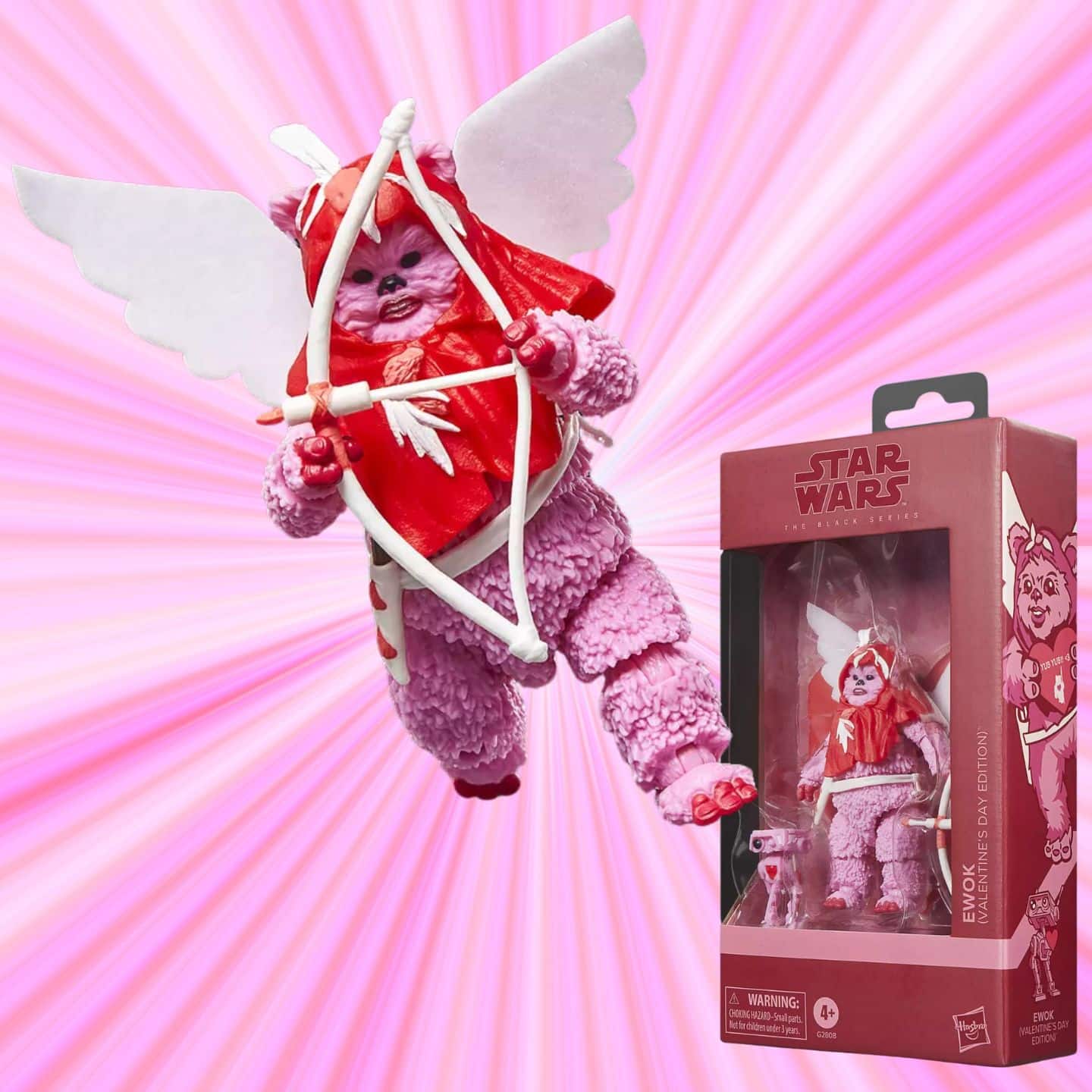Die 15 cm große Figur zeigt einen Ewok mit roten und pinkfarbenen Akzenten, Stoffflügeln und einer herzförmigen Grußkarte. Dazu gibt es Pfeil und Bogen sowie einen kleinen BD-Droiden in passender Farbgebung. Das Design erinnert an klassische Valentinstagsmotive, bleibt aber klar im Stil der Star Wars Black Series.