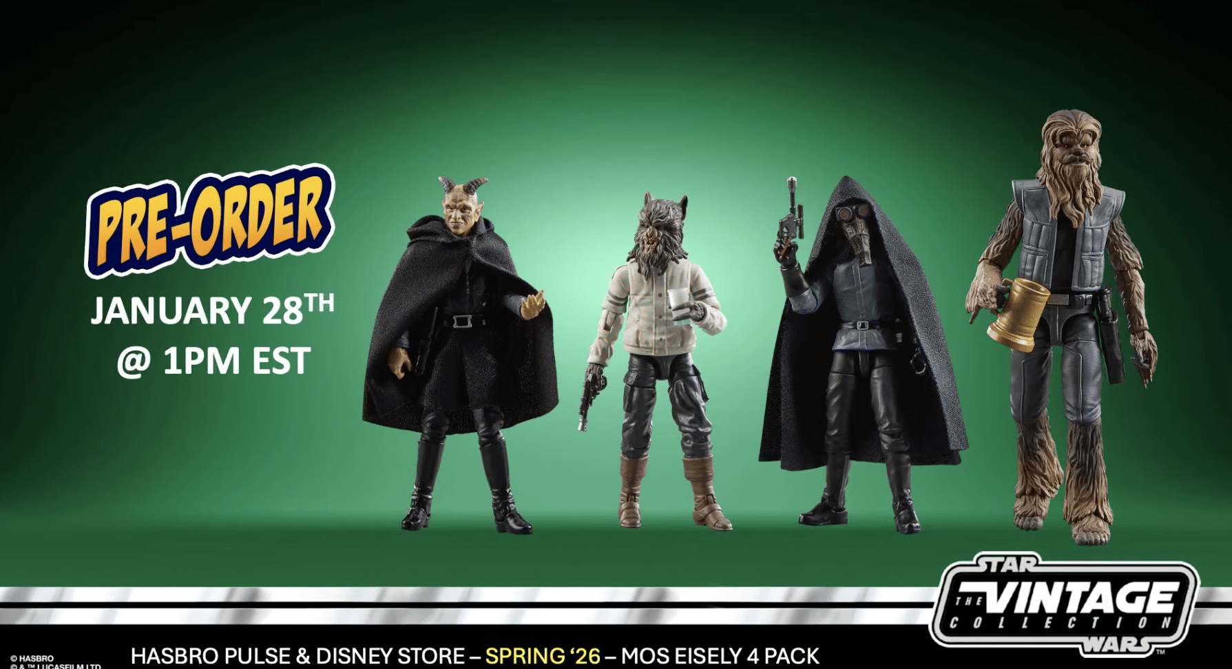 Den Auftakt für die Vintage Collection im Frühling 2026 macht das lang erwartete Mos Eisley Cantina 4-Pack. Dieses Special Action Figure Set enthält die Charaktere Labria, Garindan, Chalmun und Arleil Schous. Wichtig für Sammler ist der Umstand, dass die Figuren nicht einzeln auf Karte verpackt sind. Daher besitzen sie keine klassische VC-Nummer für die Archivierung. Besonders Chalmun sticht durch einen neuen Head Sculpt und bewegliche Handgelenke hervor. Die Figuren von Labria und Garindan überzeugen zudem durch den Einsatz von echten Stoffelementen. Vorbestellungen für dieses Set starten am 28. Januar um 19:00 Uhr unserer Zeit bei Pulse und Disney.