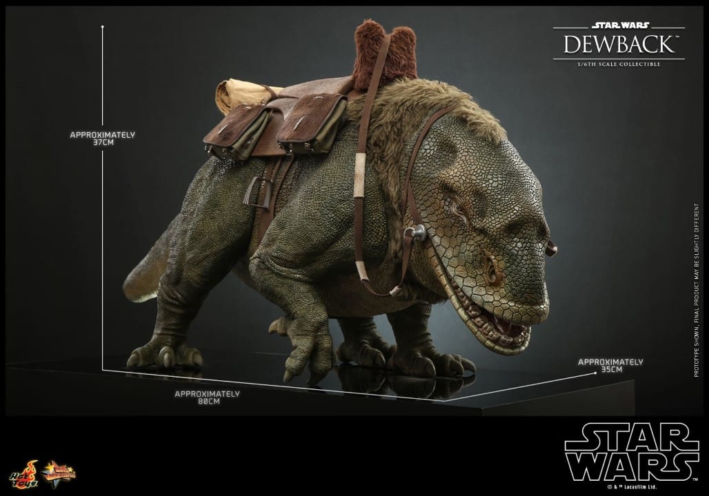 Rugged reptiles with thick hides, dewbacks are plodding but reliable mounts. When prodded by their riders, they are capable of brief bursts of surprising speed. Revisiting the memorable scene of the Sandtrooper™ discovering a droid part in the vast Tatooine™ desert in Star Wars: Episode IV A New Hope, Sideshow and Hot Toys are thrilled to introduce the extraordinary Dewback Sixth Scale Collectible Figure! The highly-accurate Dewback collectible figure is skillfully developed based on the appearance of the creature in the film. Approximately 80cm in length, the magnificent collectible features greatly detailed head and body texture, an interchangeable open-mouth head, and a saddle for its rider! This Deluxe Version will exclusively feature an interchangeable closed jaw and right standing leg for more display options!