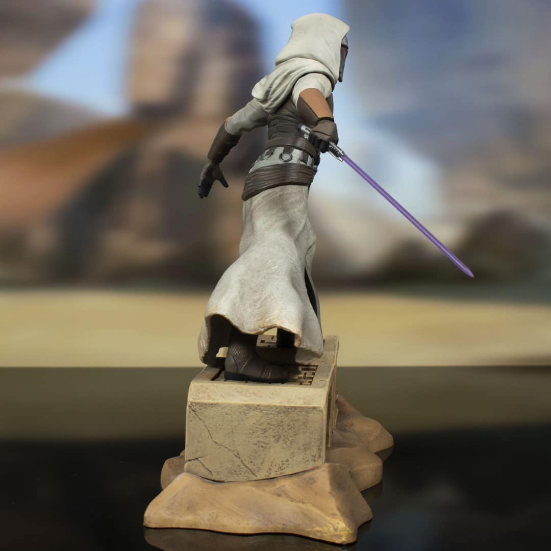 A Gentle Giant LTD release! Darth Revan returns from the Dark Side in this all-new Gallery PVC statue based on the Old Republic video game! Wearing his white robes and wielding a purple lightsaber, the Jedi Revan stands atop some ancient stone ruins and stands approximately 10 inches tall. Made of high-quality PVC, this statues features detailed sculpting and paint applications, and comes packaged in a full-color window box.