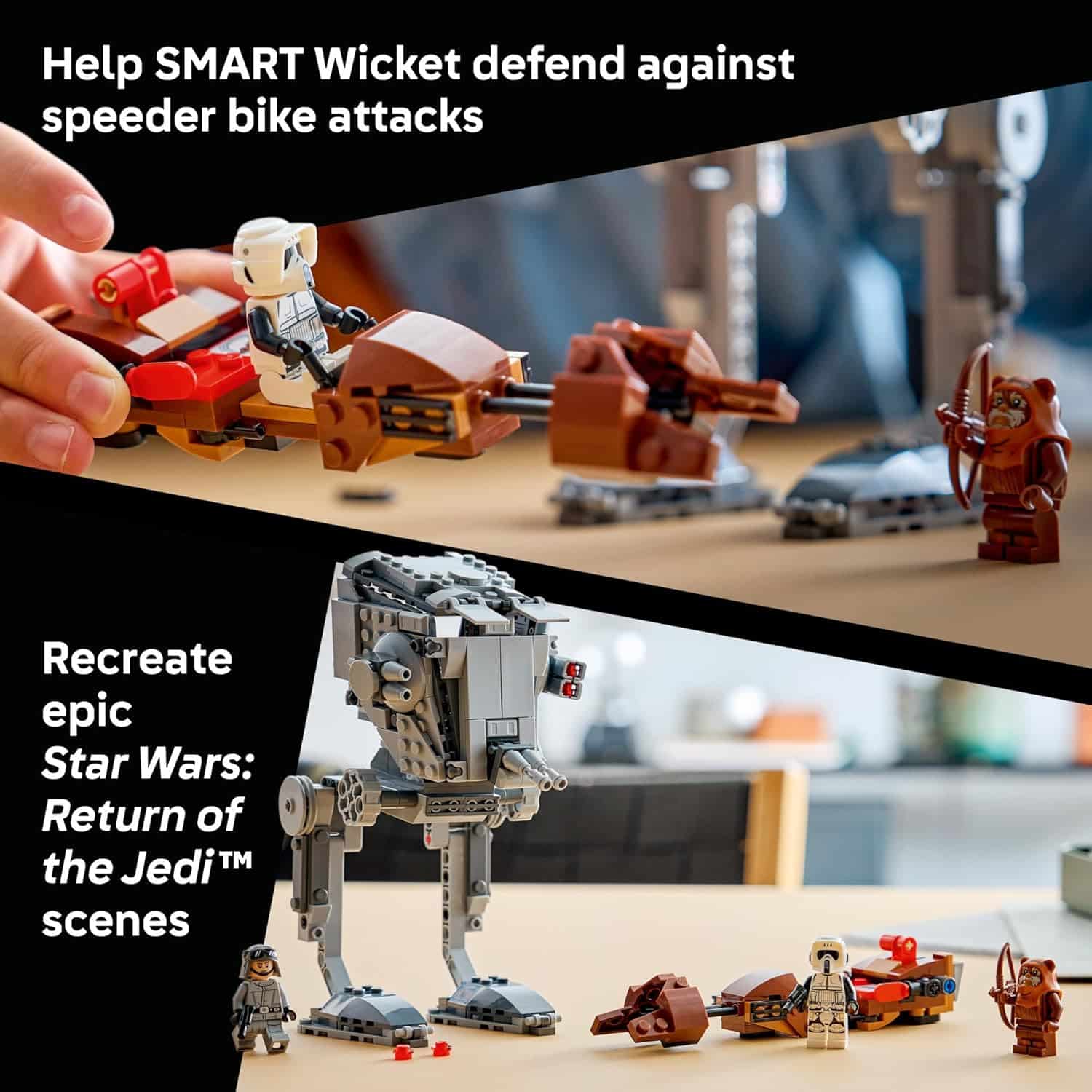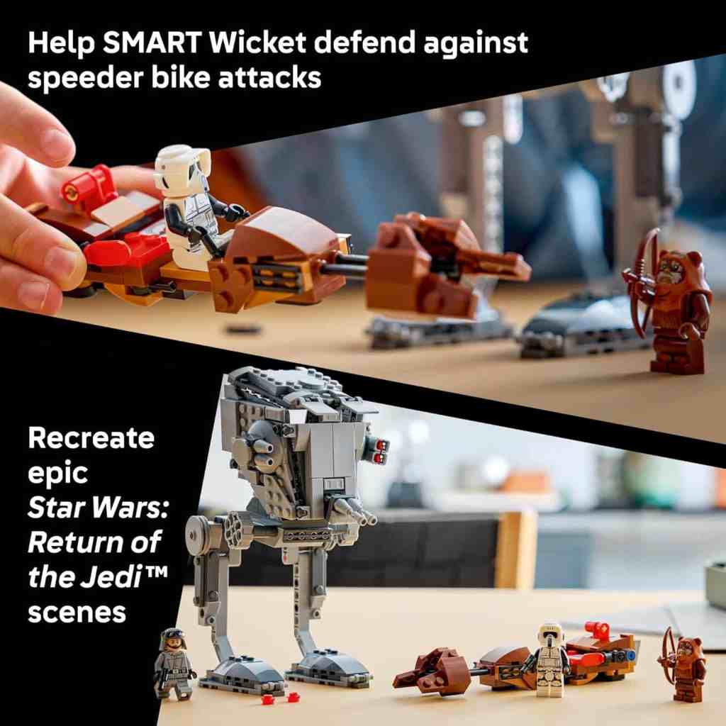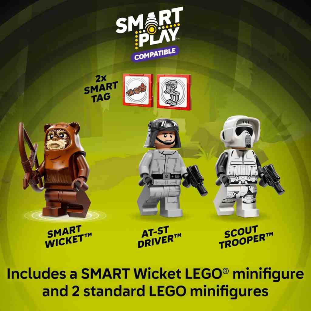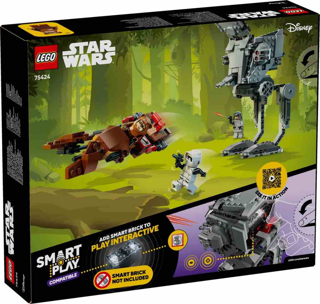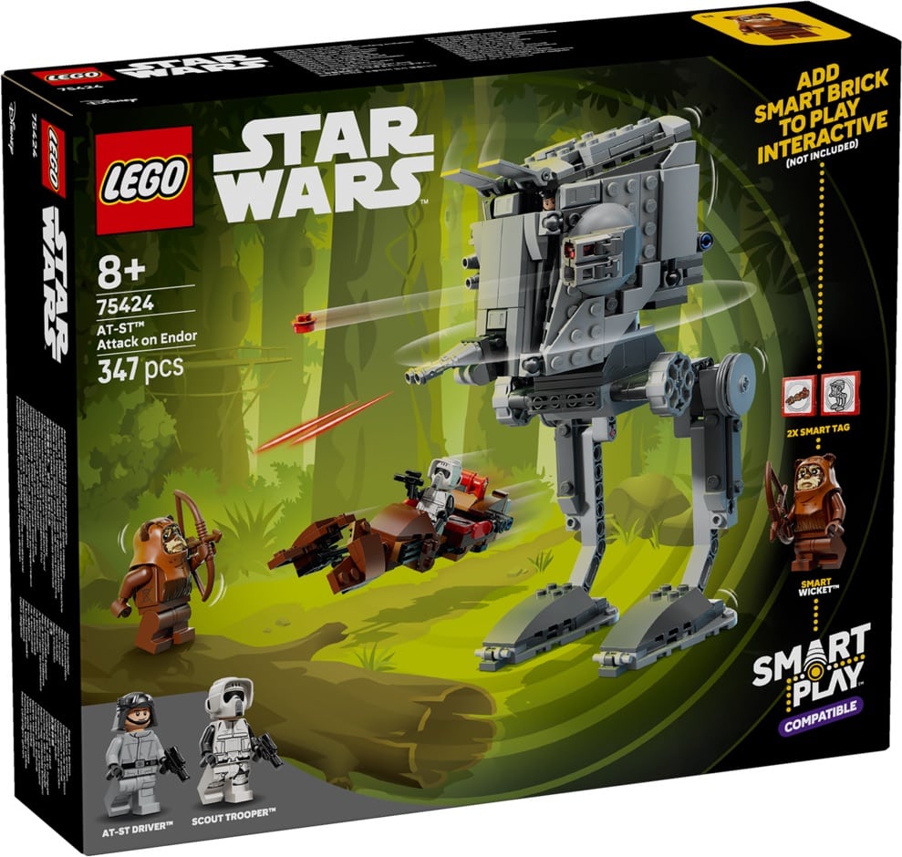Für Fans von Episode VI erscheint mit AT-ST Attack on Endor (75424) ein 347 Teile starkes Set für 49,99 Euro. Der Fokus liegt hier auf der Dynamik zwischen dem Kampfläufer und den Ewoks. Wird ein Smart Brick integriert, übersetzt das System die Bewegungen des Walkers in schweres, mechanisches Stampfen und Laserfeuer. Das Set beinhaltet drei Minifiguren, darunter eine Smart-Version von Wicket, sowie einen AT-ST Piloten und einen Scout Trooper.