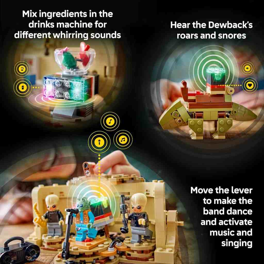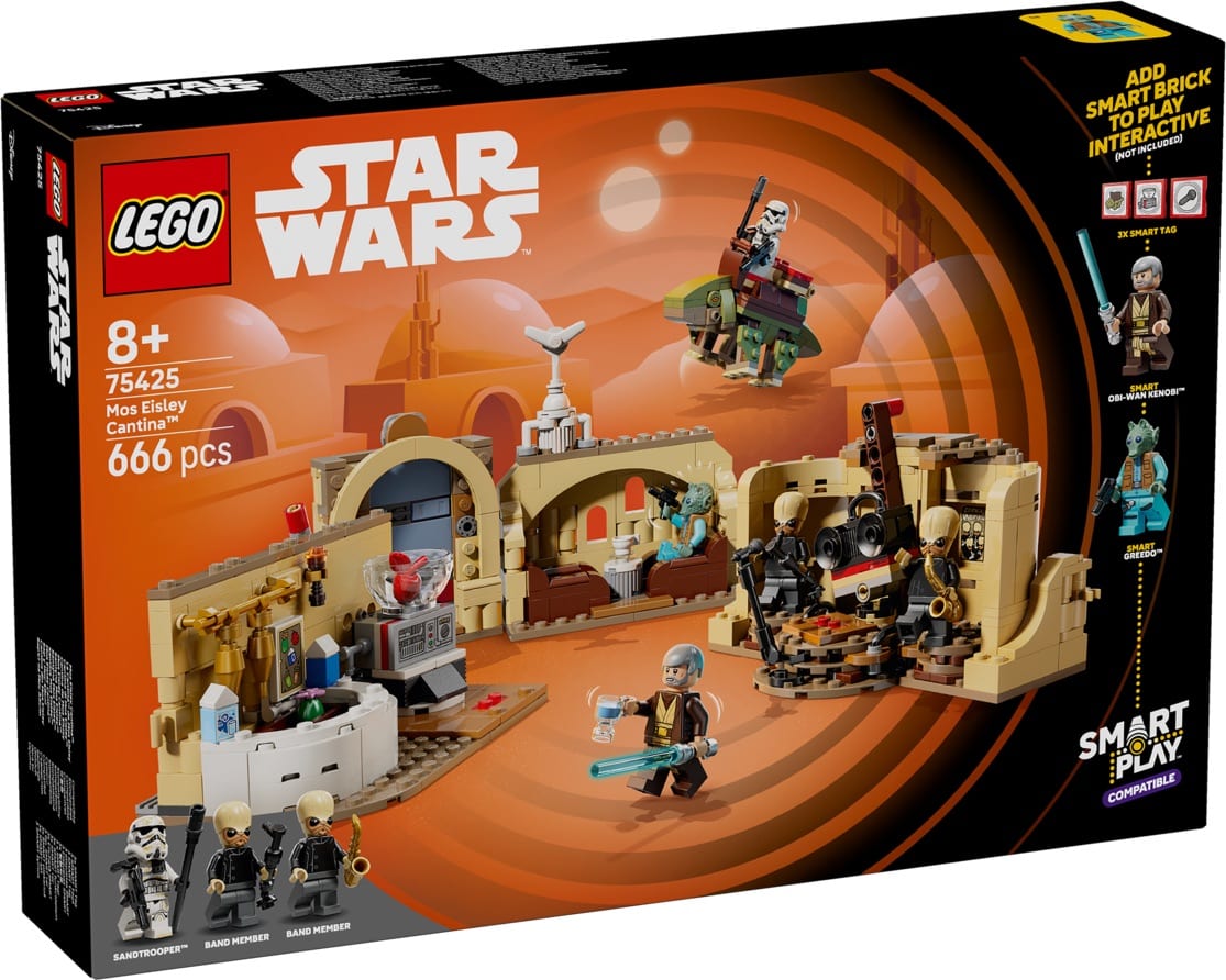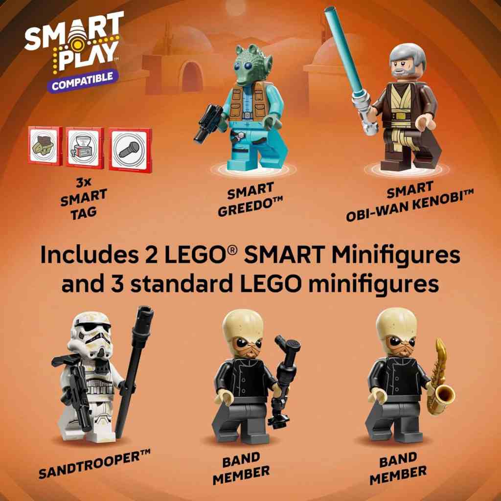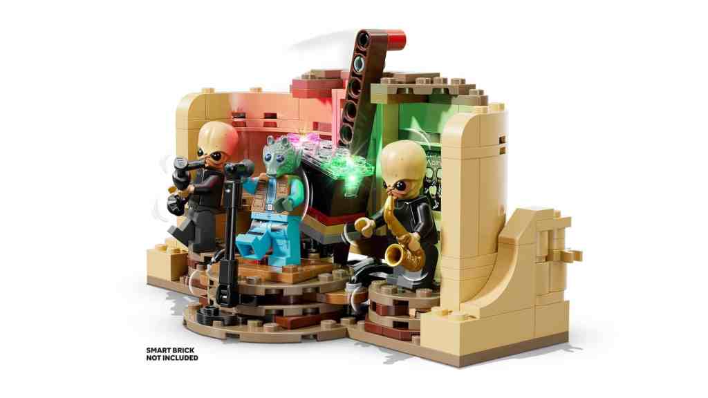 Ein echtes Novum im Bereich der Sound-Interaktion stellt die Mos Eisley Cantina (75425) dar. Mit 666 Teilen und einem Preis von 79,99 Euro ist dieses Spielset modular aufgebaut. Die Besonderheit liegt in der Akustik: Setzt man den Smart Brick ein, erwacht die Cantina-Band zum Leben. Das System kann Musik, Gesang und das typische Hintergrundgemurmel der Barbesucher abspielen. Mit Smart Obi-Wan Kenobi, Smart Greedo sowie drei weiteren Figuren bietet dieses Set eine breite Palette an Auslösern für verschiedene Szenarien.